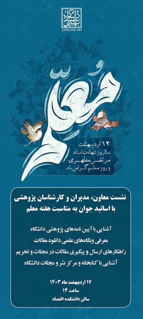 در این نشست که به همت معاونت پژوهشی دانشگاه شهید بهشتی و به مناسبت هفته معلم برگزار می شود مباحثی چون آشنایی با آیین‌نامه‌های پژوهشی دانشگاه، معرفی وبگاه‌های علمی دانلود مقالات، راهکارهای ارسال و پیگیری مقالات در مجلات و تحریم و همچنین آشنایی با کتابخانه و مرکز نشر و مجلات دانشگاه بحث و بررسی خواهد شد.